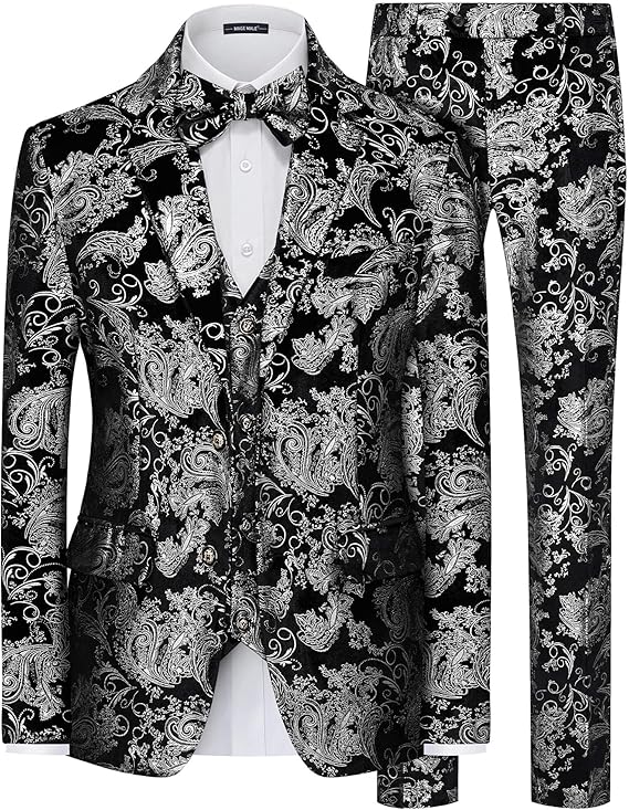 Mens Suits Dress Floral Tuxedo Slim Fit 3 Piece Suit 2 Button Prom Party Blazer Vest Pants Set with Bow Tie