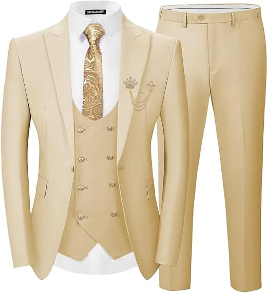Men 3 Pieces Suits Slim Fit Wedding Prom Solid Blazer Double Breasted Vest and Pants Gold Button Tuxedo Set