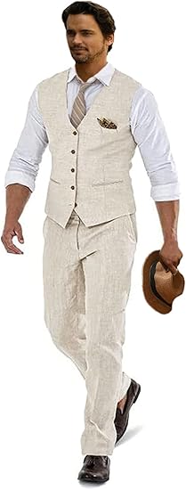 Linen Suits for Men Casual Wedding Suits Men 2 Piece Suits Groomsmen Tuxedos Summer Beach Prom Vest and Pants Set
