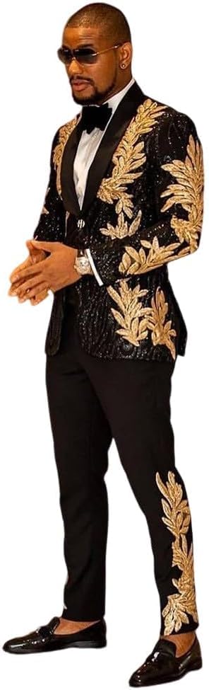 Men's Suit 2 Pieces Blazer and Pants Black with Gold Applique Fit for Wedding Prom