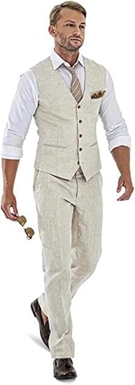 Casual Linen Beige Men's 2 Piece Suits Wedding Suits Slim Fit Groomsmen Tuxedos Summer Linen Vest Pant